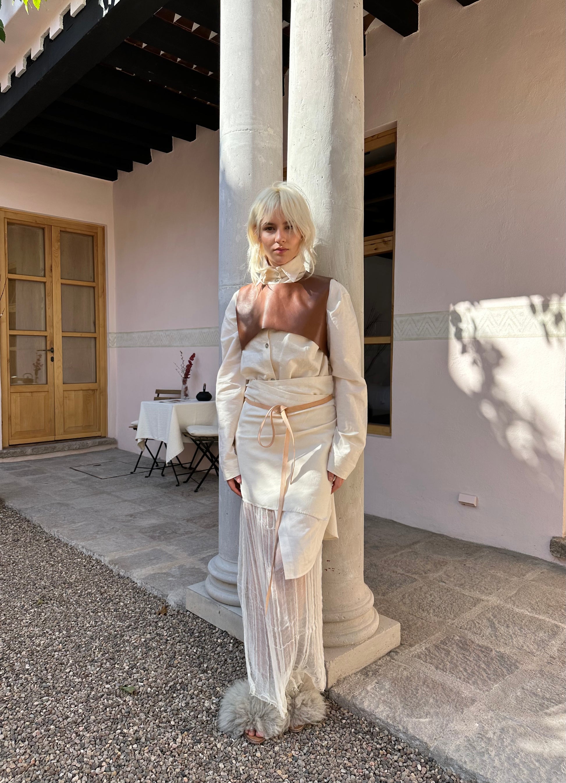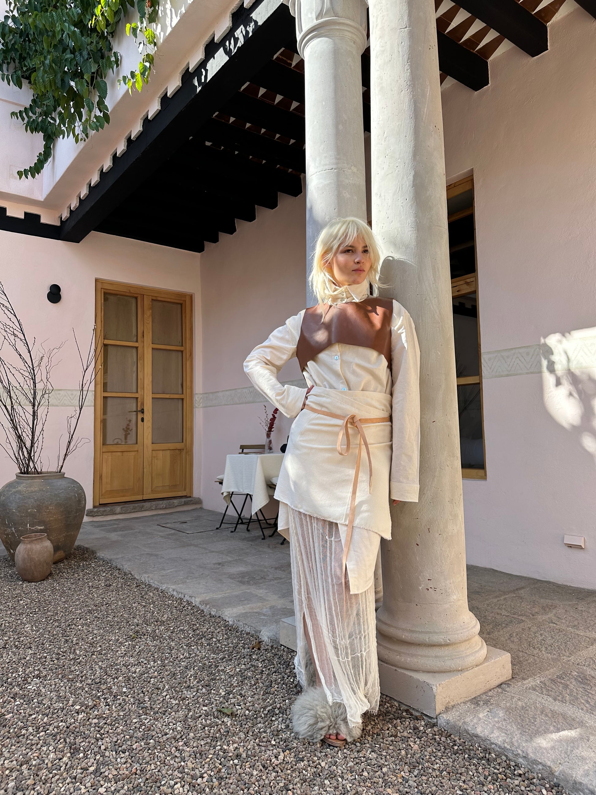 Chaleco corto de piel color café con botón charro de cuerno de toro.