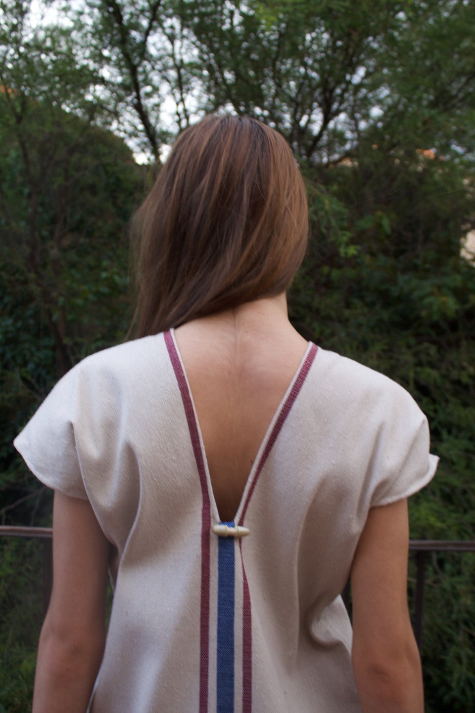 Huipil corto de telar de pedal con líneas rojas y azul y detalle de botón charro.