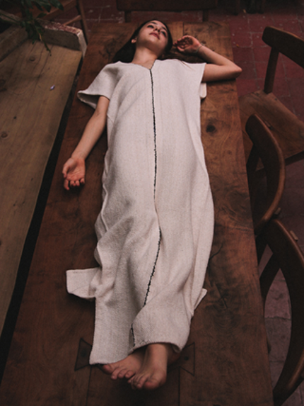 Huipil de jerga unido a mano largo y detalle de fuete de piel color crudo.